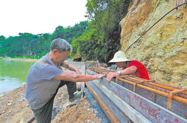 7月4日,花垣县花垣镇花垣河竹篙滩电站至浮桥社区河段治理工程现场,工人在铺设钢筋、制作模板,为建设临水栈道作准备。该工程沿岸长2公里,建设内容包括河道治理、景观绿化、游步道、防洪保安等,投资7700万元,完工后将形成亲水、滨水、临水的立体式水生态景观,为市民提供又一个休闲好去处。 本报特约记者 龙艾青 摄